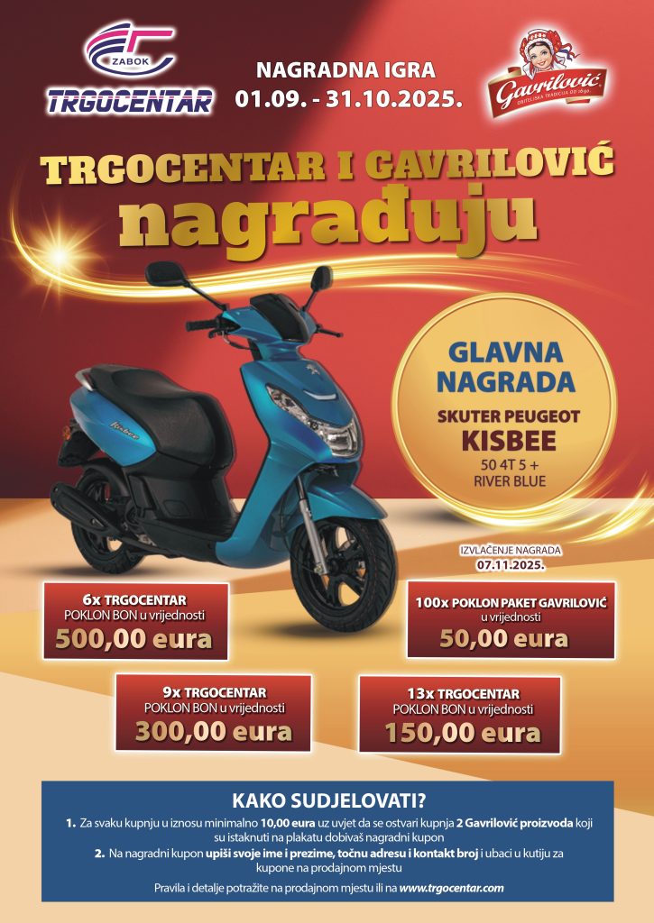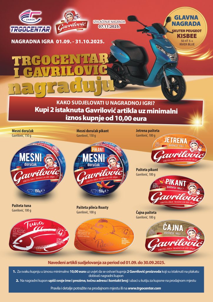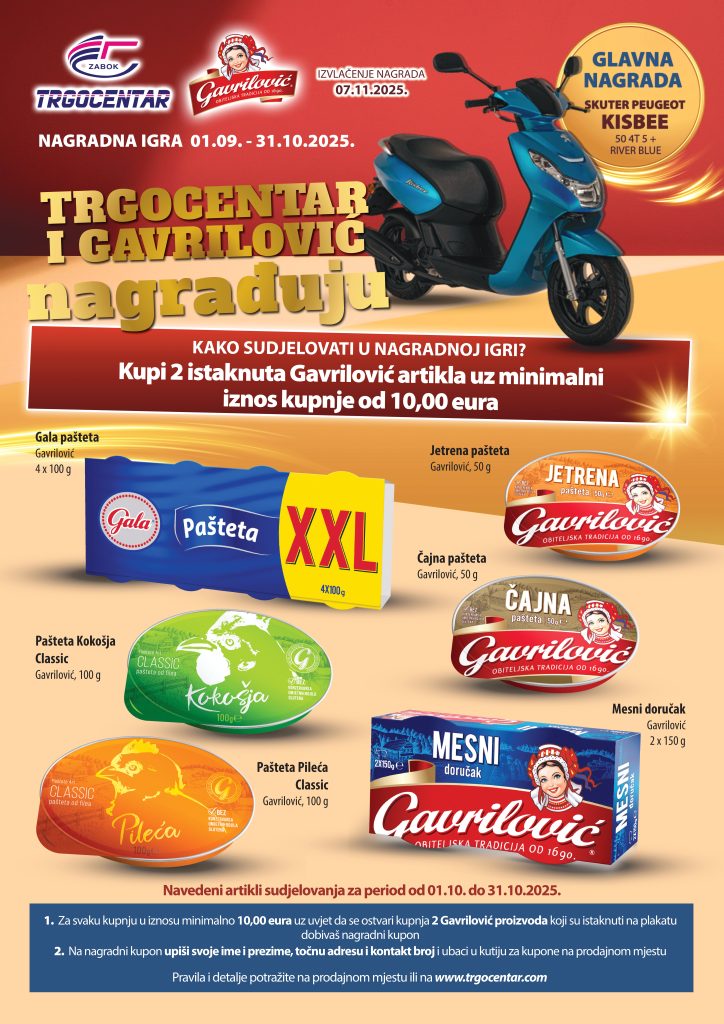 Sudjelujte u nagradnoj igri “Trgocentar i Gavrilović nagrađuju” koja traje od 01.09. do 31.10.2025. i osvojite vrijedne nagrade!