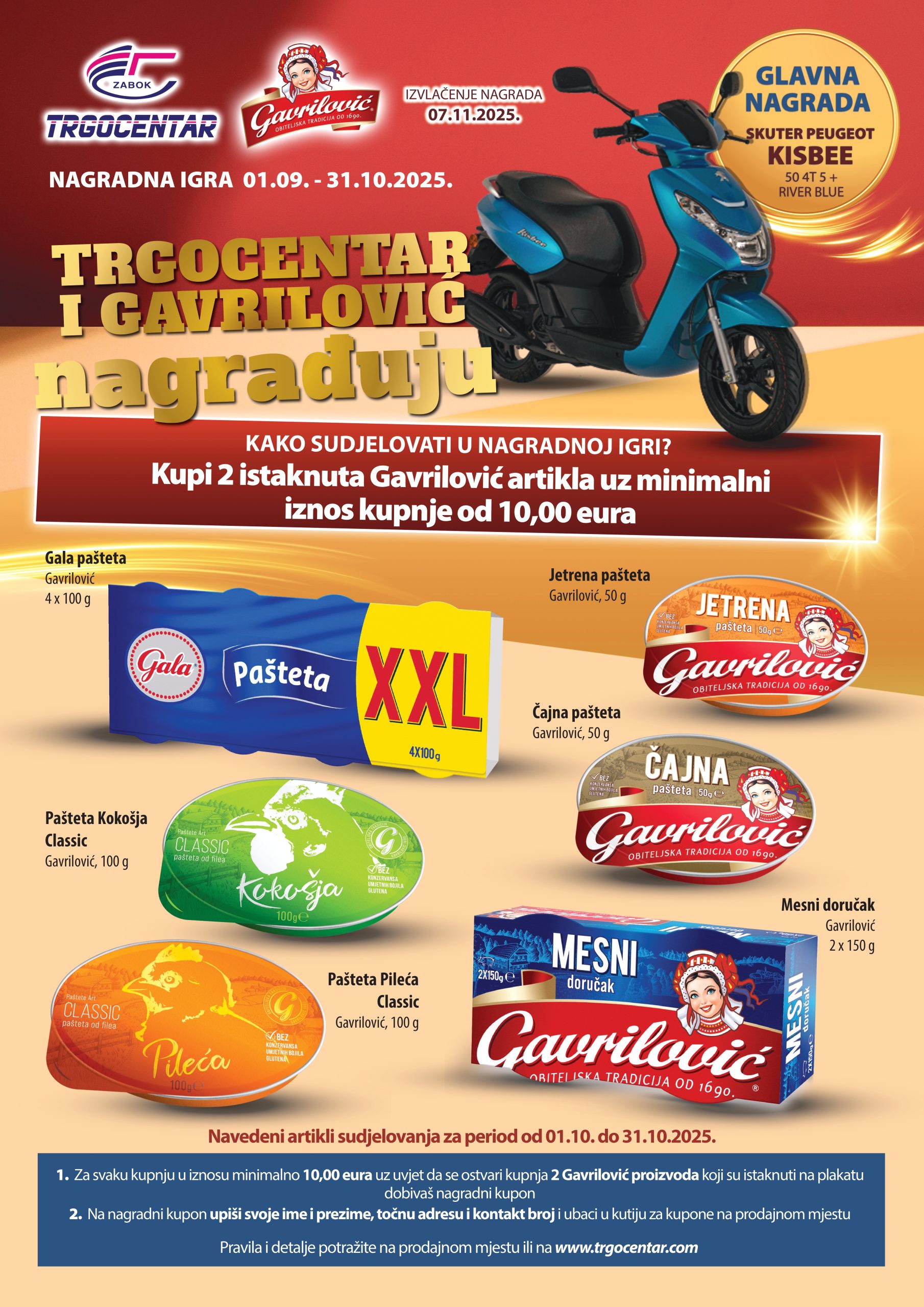 Sudjelujte u nagradnoj igri “Trgocentar i Gavrilović nagrađuju” koja traje od 01.09. do 31.10.2025. i osvojite vrijedne nagrade!